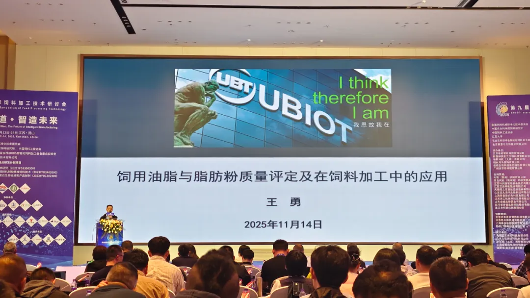 除了展区互动,优百特更以学术分享为纽带,搭建技术传播桥梁。11 月 14 日下午,优百特总工程师王勇如期带来《饲用油脂与脂肪粉质量评定及饲料加工中的应用》主题报告,从油脂质量评定方法、脂肪粉加工工艺优化、功能性脂肪酸应用场景等维度,深入解析如何通过精细化管控提升脂肪利用率 10%-30%,既解决腹泻、脂肪肝等养殖难题,又降低饲料成本与资源浪费,为行业提供兼具科学性与实操性的解决方案,报告引发全场强烈共鸣。
